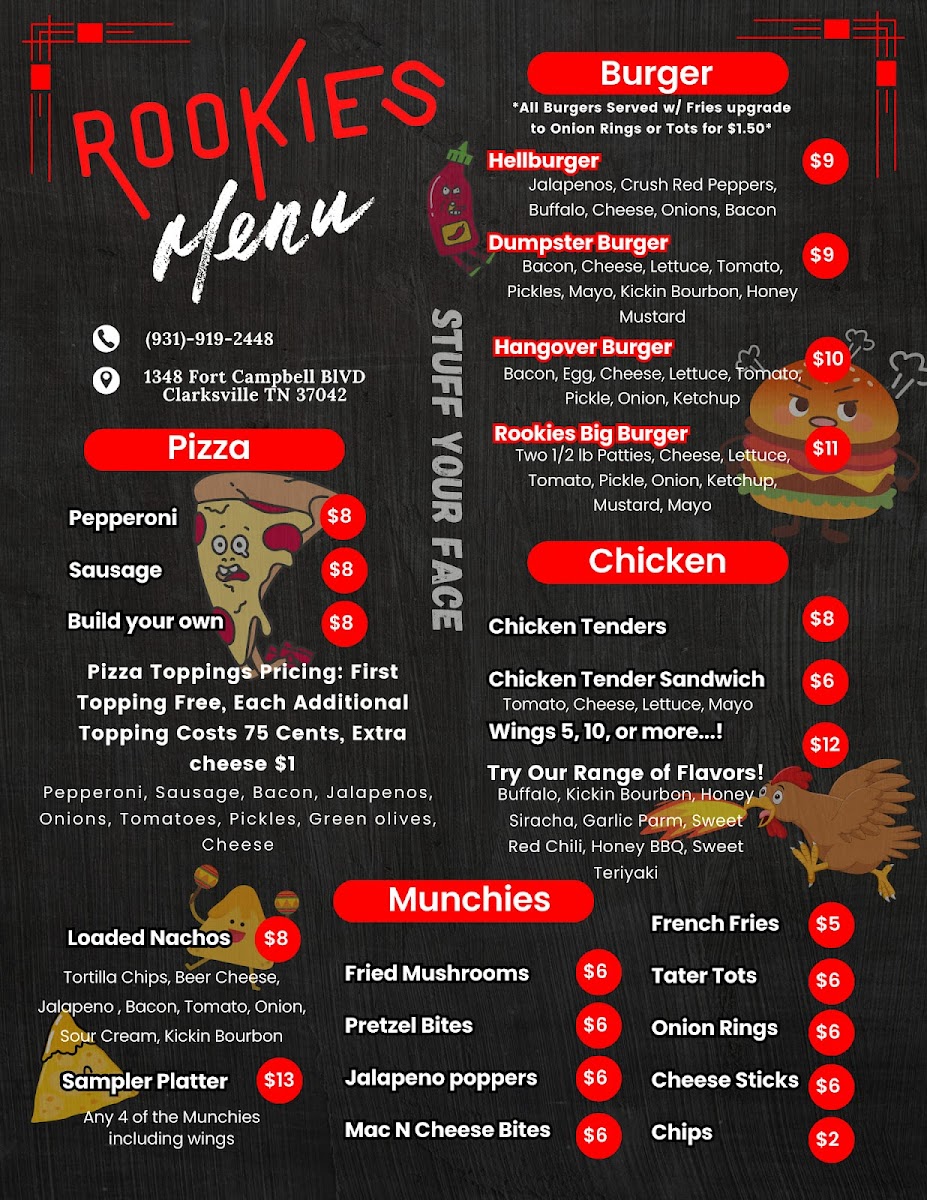 Welcome to Rookies Sports Bar - Clarksville, your next go-to destination for a night of fun, laughter, and satisfying bites! Located at 1348 Fort Campbell Blvd, this inviting local spot combines the essence of a classic dive bar with the energy of a lively social hub. Whether you're catching a game with friends or celebrating a special occasion, Rookies is designed for those who appreciate the simpler joys of good food and great company.